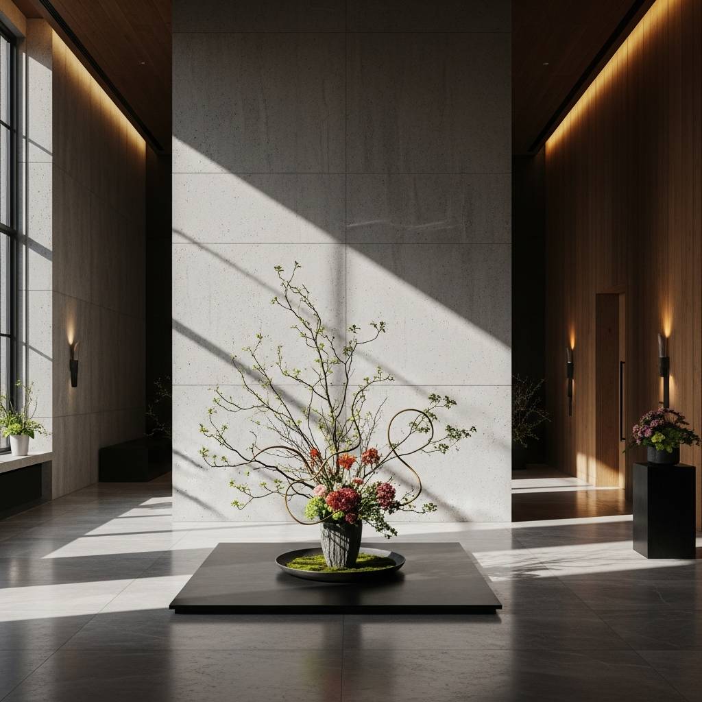 「華道」や「生け花」と聞くと、畳のある床の間や厳格な和室をイメージしがちですが、実は現代的な洋風建築やマンションのモダンなインテリアこそ、その真価を発揮する最高のステージです。西洋のフラワーアレンジメントが空間を埋める「足し算」のアートであるのに対し、日本の華道は空間を切り取る「引き算」の美学を持っています。この余白を生かしたデザイン性が、ミニマルなリビングやスタイリッシュな玄関に洗練された空気感をもたらします。